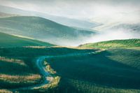 This stunning photograph of a country road winding through the misty hills of Volterra captures the essence of Tuscany in the early morning light.