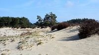 Ik heb deze foto gemaakt op de Hulshorsterzand in de gemeente Nunspeet op de Veluwe. Zoals je ziet staan op deze zandverstuiving bomen zoals de grove den maar ook grassen, mossen en ook heide. Het zand op dit stuk zandverstuiving word vast gehouden door de heide en de de gras. Het is een lang stuk duin wat gevormd word door de wind en de struiken.