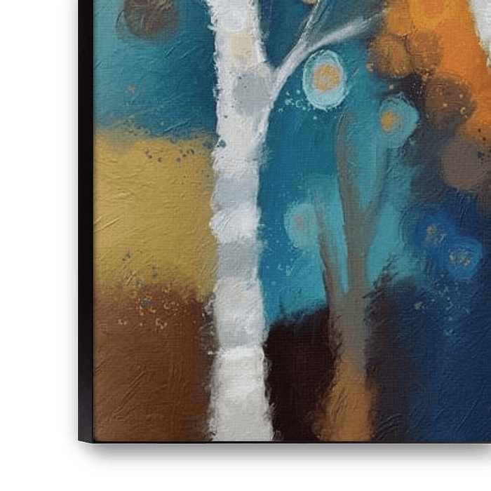 Een levendige reeks gestileerde bomen strekt zich uit over het frame, met een veelheid aan kleuren en grillige vormen. Elke boom is uniek en de takken verstrengelen om een gevoel van beweging en harmonie te creëren.