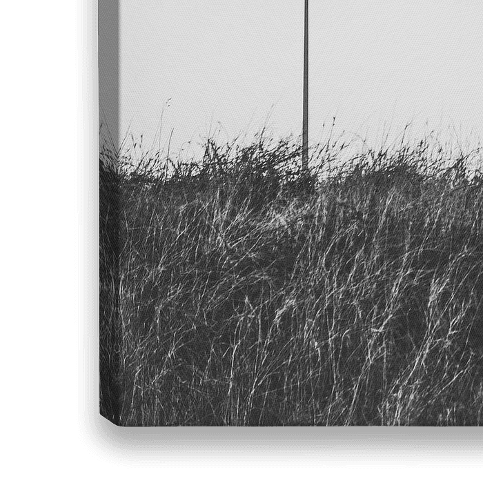 In het land schap een opslagtank en een lantaarn paal. Een koude dag een sterke wind. De harde lijnen en het helmgras als contrast tegenover elkaar. Het harde licht en de lege hemel. Een industrieel landschap in zwart wit gefotografeerd.