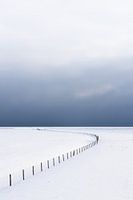 Een leeg winters landschap bedekt met sneeuw in het Nationaal park Lauwersmeer. Aan de horizon drijven donkere sneeuwwolken binnen en geven het landschap een dreigende sfeer. Een minimalistische foto.