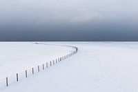 Een leeg winters landschap bedekt met sneeuw in het Nationaal park Lauwersmeer. Aan de horizon drijven donkere sneeuwwolken binnen en geven het landschap een dreigende sfeer. Een minimalistische foto.