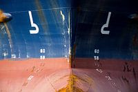 Deze boeg van een zeeschip, de roestsporen het half geschilderde ijkmerk de randen van de kluisgaten.