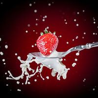 Een lekkere, rijpe, rode aardbei valt op een eetlepel melk tegen een achtergrond van een donkerrode gradiënt - Strawberry Splash