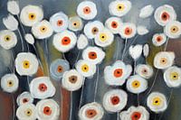 Delicate witte bloemen met levendige harten in oranje, gele en bruine tinten steken af tegen een gedempte, abstracte achtergrond. De minimalistische en gestileerde afbeelding benadrukt de schoonheid en eenvoud van de bloemen.