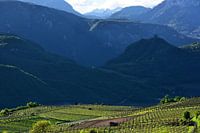 Een lentemorgen in de regio Überetsch in Zuid-Tirol. De tegengestelde zon schijnt op de wijngaarden op de lagere hellingen, terwijl de westelijke hellingen van de bergen nog steeds in de schaduw liggen. Kaltern, Zuid-Tirol, lente 2014