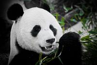Koop de foto Een leuk panda volledig gezicht eet een heldere sappige bamboescheut op een donkere achtergrond. van Michael Semenov op canvas, aluminium dibond, (ingelijste) fotoprint, behang en ArtFrame, op maat geprint in Fine-Art kwaliteit.