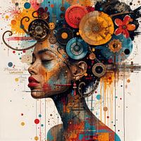Een levendig en gemengd kunstwerk van een vrouw met een grote verscheidenheid aan kleuren, subtiele kleurovergangen en rijke toonwaarden. Het nodigt de kijker uit om de schoonheid van kunst in al haar vormen te ontdekken en waarderen.