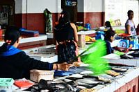 Deze authentieke scène legt een typisch moment vast op een markt in Boac, op het eiland Marinduque in de Filippijnen. Op de betegelde kraampjes is een verscheidenheid aan verse vis zorgvuldig gerangschikt, wat getuigt van de maritieme rijkdom van de regio's. Met de hand geschreven etiketten geven de prijzen aan, wat de traditionele…