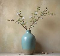Een zachte blauwe beige stenen kruik vaas met takken en witte groene bladeren en bloesem op bruin beige early dew achtergrond geinspeerd op minimalisme wabi sabie eenvoudige stijl.