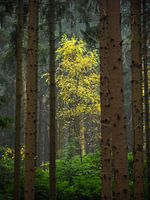 In het donker van een bos met vooral naaldbomen is er een plek die voor een prachtige herfstkleur zorgt. Het licht valt precies op de gele bladeren.