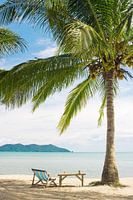 Een rustig strandje op één van de eilanden in de Thaise Ko Chang archipel vlakbij de grens met Cambodja. Een tropisch beeld, met wuivende palmbomen, blauwe zee en wit zand. In de verte zie je een ander eiland liggen.