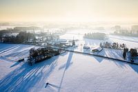 Een luchtfoto van een vroege ochtend boven een besneeuwd landschap in de Achterhoek van Jeroen Kleiberg