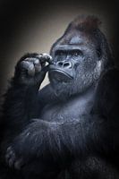 Een machtige mannetjesgorilla houdt zijn hand voor zijn mond, alsof hij nadenkt, machtige handen en een lichte black-out