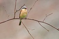 Een mannetje van de grauwe klauwier zit op een tak op zoek naar prooi voor zijn broedsel