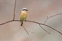 Een mannetje van de grauwe klauwier zit op een tak op zoek naar prooi voor zijn broedsel