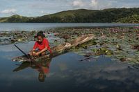 Een meisje is aan het vissen op de traditionele wijze met een kleine houten kano op het Sentani meer, bij Jayapura in Papoea, Indonesie.