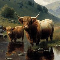 Dit prachtige schilderij toont een Schotse Highland rund in het midden van een prachtig landschap. De koe staat op een groene weide en kijkt in de verte, terwijl op de achtergrond bergen te zien zijn. De omgeving wordt gekenmerkt door rijke groentinten en straalt een vredige en harmonieuze sfeer uit. Het schilderij wordt gekenmerkt door de vloeiende penseelstreken en heldere kleuren die het vee en het landschap tot leven brengen.