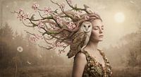 Een serene, dromerige portretfoto van een vrouw met gesloten ogen, waarbij haar haar overgaat in bloeiende takken vol kleine vogels. Een kerkuil rust zacht op haar schouder en symboliseert wijsheid en harmonie. Het zachte licht en de nevelige bosachtergrond roepen een gevoel op van rust, vernieuwing en een diepe verbondenheid met de…