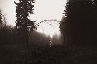 In dit verstilde beeld buigt een menselijk figuur zich mee met de natuurlijke lijnen van het landschap. De houding weerspiegelt de kromming van de boom en versterkt het gevoel van verbondenheid tussen mens en natuur. De nevelige achtergrond en het zachte, monochrome palet creëren een tijdloze en contemplatieve sfeer, waarin de grens…
