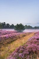 Een mistige heide bij Heidestein, Nederland.