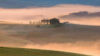 Een 16:9 foto van een vroege voorjaarsochtend tijdens zonsopkomst met mist boven het land en een Agriturismo in het hart van Toscane, in Val d'Orcia, gelegen tussen Pienza en San Quirico d'Orcia in Midden-Italië.