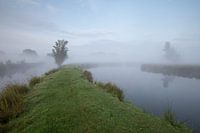 's-Morgens vroeg nog voor zonsopkomst aan de dommel in de polder. Er hangt wat mist boven het water en de weilanden.