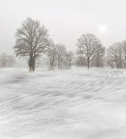 Een sfeervol winterlandschap met bomen, grondmist en een vage zon in de grijze lucht. De kale bomen en het ontbreken van kleur maken het bijna een zwart-wit foto. in de mist is een apart lijnenspel zichtbaar.