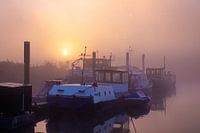 Een mistige zonsopkomst aan het water. Dit in combinatie met de bootjes zorgt voor een rustgevende sfeer.