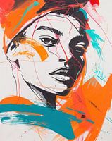 Een fashion illustratie van een vrouw, met sterke kleuren en expressieve lijnen die haar moderne stijl vangen in een abstract compositie. Het werk toont een close-up portret van een stijlvolle vrouwelijke figuur die moderne kleding draagt, met vlammende kleurvlakken op wit papier, creërend een gevoel van beweging en energie. Het focus is op haar gezicht.
