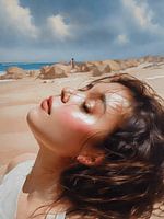 Dit portret van een jonge, mooie vrouw vangt de ultieme rust en vreugde van een zomerse dag aan zee. Liggend op het warme zand met haar ogen gesloten, voelt ze de zon op haar huid en de zachtheid van de bries. Haar ontspannen houding en serene gezichtsuitdrukking stralen genieten en vrijheid uit, alsof de wereld even stilstaat.