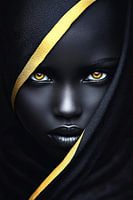 De foto toont een mooie Afrikaanse vrouw wiens gezichtsuitdrukking zowel kracht als gratie uitstraalt. Haar hoofddoek, die donker van kleur is en goudkleurige randen heeft, omlijst haar gezicht en accentueert op elegante wijze haar gelaatstrekken. De diagonale halslijn van de hoofddoek trekt het oog naar haar stralende gele ogen, die…