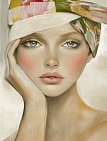 Dit kunstwerk toont een vrouw met helderblauwe ogen, vol zachtheid en kalmte. Ze draagt een kleurrijke sjaal om haar hoofd die subtiel contrasteert met haar delicate huid en natuurlijke gelaatstrekken. Haar hand rust nonchalant tegen haar gezicht, wat haar houding ontspannen en contemplatief maakt. De zachte, warme kleuren en het gebruik van licht benadrukken haar serene en dromerige uitstraling.