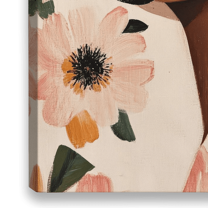 Deze dame straalt rust en zelfvertrouwen uit met haar ogen gesloten, alsof ze zich volledig overgeeft aan een moment van innerlijke vrede. De zachte bloemen op haar kleding geven het geheel een dromerige, bijna meditatieve sfeer. Een bijzondere blikvanger voor je interieur!