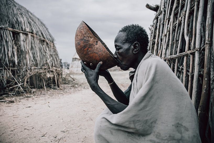In dit beeld drinkt een man van de Arbore-stam uit een kalebas, zittend voor zijn hut in de Omo vallei in Ethiopië. De kalebas, een uitgeholde en gedroogde vrucht, wordt al generaties lang gebruikt voor het bewaren en drinken van melk of andere vloeistoffen.
