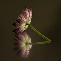 "Een moment van stille reflectie: Rust in de muurdecoratie" is een macrofoto van een stilleven van een Roze-paars Zeeuws Knoopje (Astrantia Major) met een abstracte weerspiegeling in het grondoppervlak. Dit grondoppervlak (en achtergrond) hebben een donkere kleur. Hierdoor steekt het Zeeuws Knoopje (Astrantia Major) mooi af tegen de…