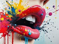 Een mond vol kleuren springt onmiddellijk in het oog. Het wit van het doek lijkt bijna te verdwijnen onder een explosie van surrealistische kleuren die uit het centrum breken. Het middelpunt is een mond, vreemd en krachtig, alsof het de drager is van een verborgen boodschap. Deze mond lijkt niet zomaar geschilderd, maar komt echt naar buiten, alsof hij uit het doek tevoorschijn wil treden en zijn boodschap in de wereld wil schreeuwen.