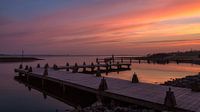 Mooi licht tijdens zonsopkomst aan de Grevelingen met steigers zonder boten.