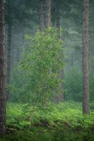 Een mooi fris groen boompje tussen de dennen en varens in natuurgebied de Moeren bij Zundert.