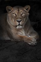 Een mooie lion met eben ogen ligt in de duisternis, ze loopt en kijkt naar je een donkere achtergrond