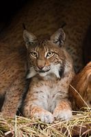 Koop de foto Een mooie lynx (grote kat) met mooie ogen en expressieve ogen rust op het gedroogde gras, een donker van Michael Semenov als print op canvas, aluminium dibond, (ingelijste) fotoprint, behang en ArtFrame. Voor jou op maat geprint in Fine-Art kwaliteit.