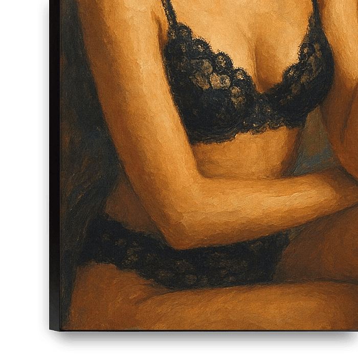Koop dit schilderij Een mooie vrouw in zwarte lingerie schilderij. van Galerij Hoppenbrouwers als reproductie geprint op canvas, aluminium dibond, (ingelijste) fotoprint, behang en ArtFrame. Voor jou op maat geprint in Fine-Art kwaliteit.