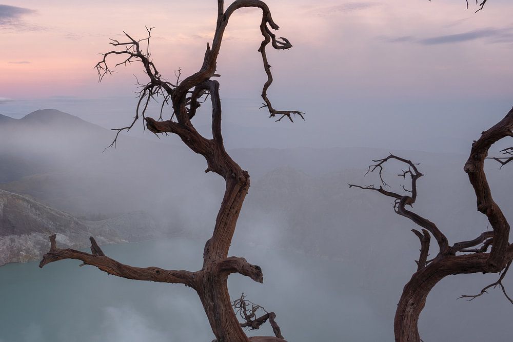 Een oude (verdorde) boom boven het meer van de vulkaan Ijen in Oost Java, Indonesie, bij zonsopkomst. Met andere bergen (vulkanen) in de achtergrond, en laag hangende bewolking boven het meer.