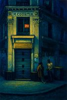 In dit werk zien we een nachtelijke straathoek in Parijs, gevangen in een sfeer die doet denken aan de schilderijen van Edward Hopper. Het zachte licht dat uit de gevel straalt contrasteert met de diepe schaduwen van de smalle straat, waardoor de twee figuren op de voorgrond een bijna filmisch karakter krijgen. Ze lijken verloren in een moment van stilte en alledaagse intimiteit, terwijl de omringende architectuur met zijn verweerde details en gesloten luiken een zekere melancholie oproept.