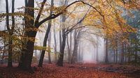 Een schilderachtig uitzicht op een herfstbos met kleurrijke bladeren en een mistige sfeer.