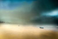 Achter hem, op de vloedlijn, ligt een klein, verlaten bootje eenzaam in het zand. De zee is kalm en de golven breken zachtjes op het strand.
