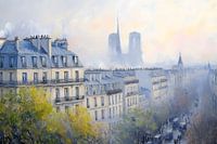 Andere karakteristieke Parijse gebouwen zijn te zien op de achtergrond, hun daken op verschillende hoogtes, waardoor het schilderij diepte krijgt. De lucht is geschilderd in zachte blauw- en grijstinten, afgewisseld met fijne mist, wat de indruk van een vredige ochtend versterkt.