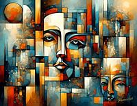 Een levendig gekleurde, abstracte voorstelling van een gezicht domineert de voorgrond, met een kleiner, vergelijkbaar gezicht in de rechterbenedenhoek. Geometrische vormen en een mozaïekachtige compositie smelten samen om de gelaatstrekken te creëren, tegen een warme achtergrond met linksboven hints van een hemellichaam.