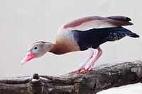 Een nieuwsgierig fluitend eendje met een rood veertje kijkt vanaf een takje naar beneden Een nieuwsgierig fluitend eendje met een rood veertje kijkt vanaf een takje naar beneden