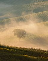 Een verticale 4:5 foto met warme tinten van een alleenstaande boom tijdens zonsopkomst met een laagje mist in Toscane, in Val d'Orcia, in midden-Italië.